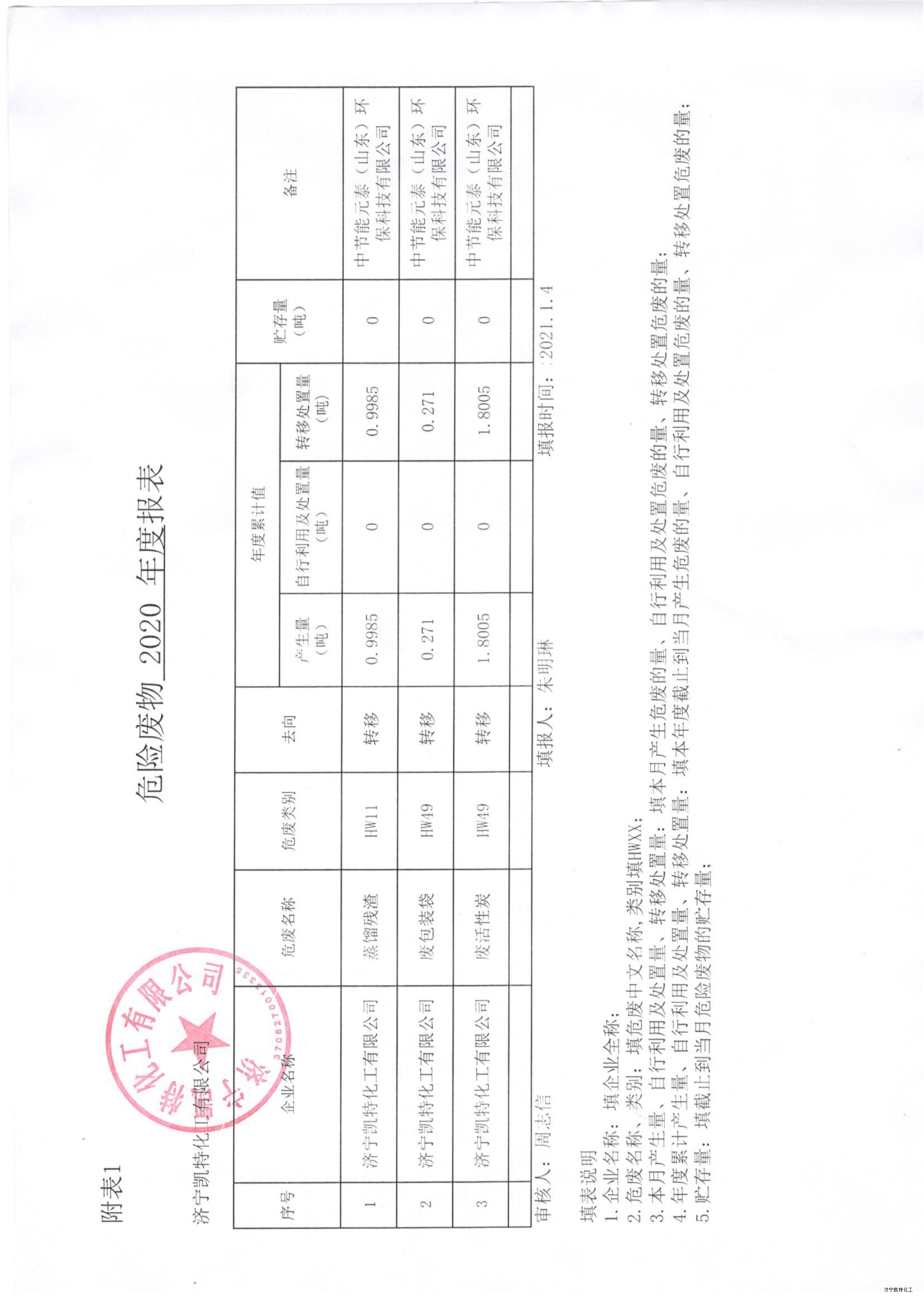 濟(jì)寧凱特化工有限公司2020年度危險廢物報表公示